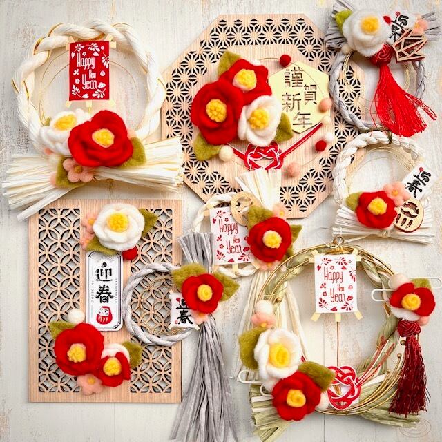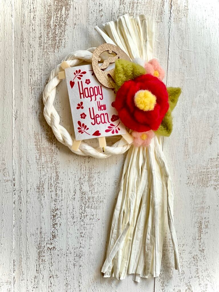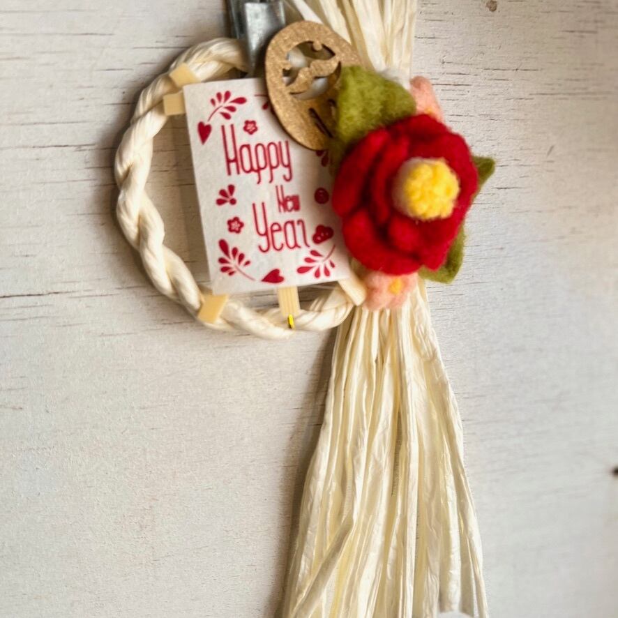 羊毛椿とHappy New Year 、だるまパーツをあしらった小さなしめ飾りです。